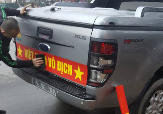 Khẩu hiệu Việt Nam vô địch dán trên chiếc bán tải Ford Ranger.