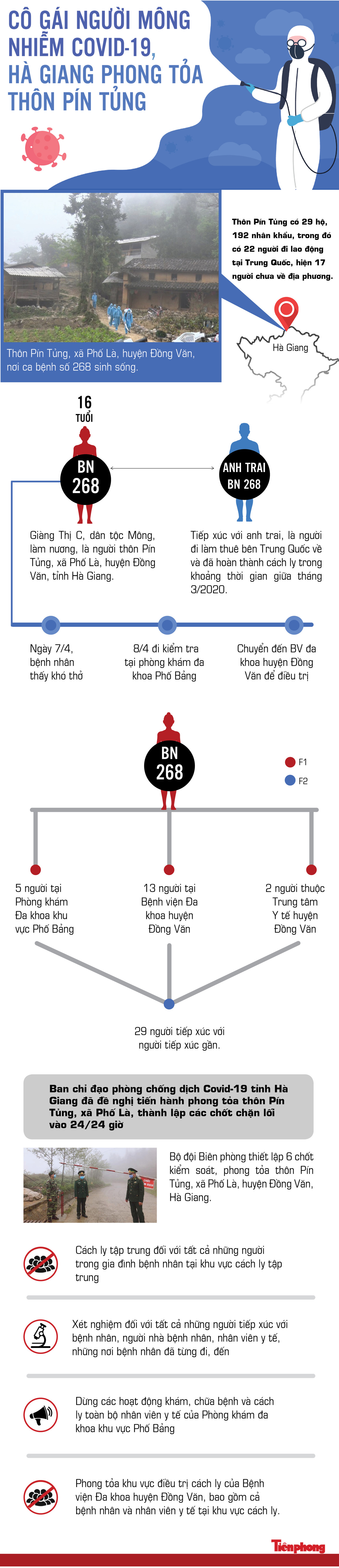 TPO - Ca bệnh đầu tiên tại vùng cao hẻo lánh mắc COVID-19 ở Việt Nam là cô gái 16 tuổi dân tộc Mông, trú tại thôn Pín Tủng, xã Phố Là, huyện Đồng Văn, tỉnh Hà Giang. Ngay sau đó, cơ quan chức năng đã tiến hành phong tỏa thôn Pín Tủng, xã Phố Là, huyện Đồng Văn, Hà Giang và thành lập các chốt chặn lối vào 24/24 giờ.