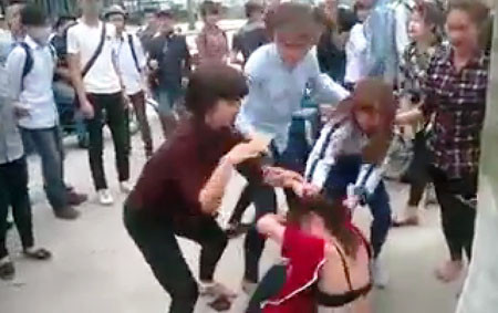 Ghi nhận của PV từ clip thì trong khoảng hơn phút, 2 cô gái bị một nhóm nữ sinh mặc đồng phục học sinh xông vào đấm, tát túi bụi. Đặc biệt, cô gái mặc áo đỏ bị nhóm nữ sinh mặc đồng phục xé rách áo và lột trần giữa đường trong sự reo hò của nhiều người vây quanh xem.