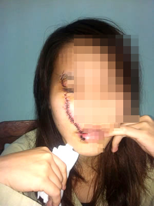 Chị T bị một nữ sinh dùng lam rạch vào mặt khi đang ngồi uống nước mía bên đường. Ảnh: Báo CATP Đà Nẵng.