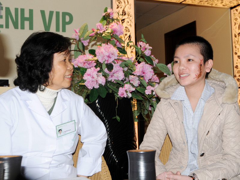 | Bác sĩ Nguyễn Thị Dụ (trái) - Giám đốc Bệnh viện Đa khoa Quốc tế Thu Cúc trao đổi về sức khỏe, ân cần dặn dò Giang và bà Hoa (phải) - mẹ Giang trước khi về quê ăn Tết. Ảnh: Tuấn Nguyễn. |