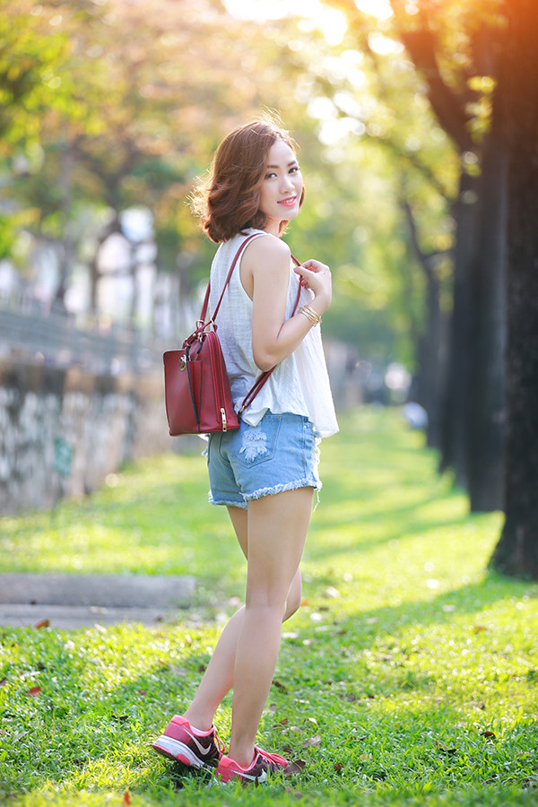 Hường cũng chọn cho mình kiểu tóc lob xoăn trẻ trung với màu nhuộm là nâu sáng để hút ánh nhìn vào gương mặt thay vì vóc dáng. Cô tin rằng tóc ngắn giúp những người có tầm vóc nhỏ bé trông có vẻ cao hơn thực tế.