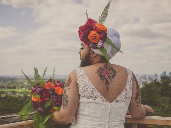 Harnaam khoe hình xăm lớn ở cánh tay trong chiếc váy cưới trắng tinh khôi.