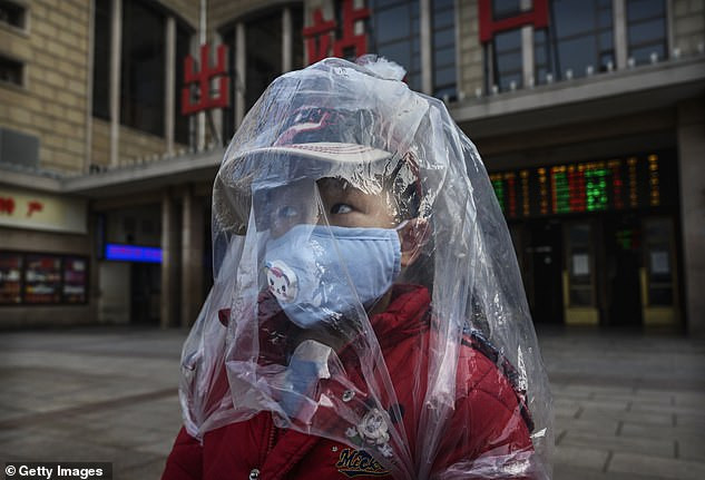 Một cậu bé ở ga tàu Bắc Kinh "trốn" trong túi nilon như một cách bảo vệ mình trước dịch bệnh covid-19.