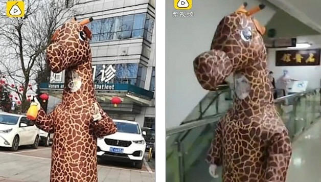 Lo sợ bị lây bệnh Covid-19, cô gái đeo khẩu trang, găng tay rồi choàng bộ đồ hươu cao cổ ra ngoài.