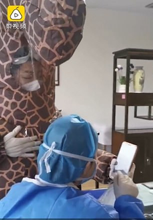 Mặc đồ hươu cao cổ, cô He gây chú ý suốt quãng đường từ nhà đến viện, đến gặp bác sĩ lấy thuốc rồi trở về nhà.