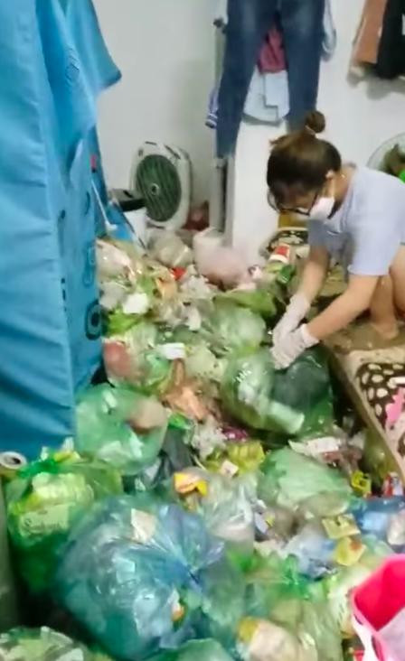 Một núi rác chất chồng khắp phòng mà N.S gọi đùa là "của để dành". Nào vỏ đồ ăn thức uống, nào quần áo, vật dụng cá nhân, hay thậm chí là đồ dùng của con gái khi đến "ngày dâu" cũng bị vứt la liệt trên giường.