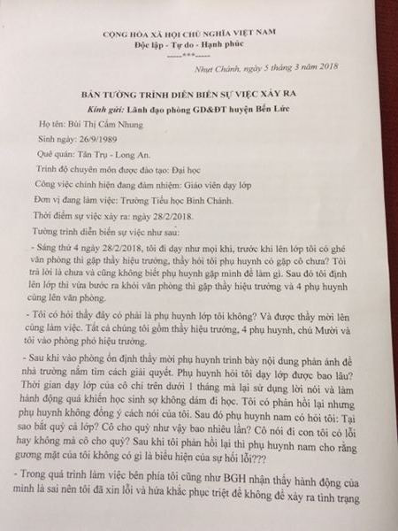 Cụ thể, trong bản tường trình gửi Phòng GD&ĐT huyện Bến Lức (Long An), cô B.T.C.N viết, sáng ngày 28/2, khi cô chuẩn bị lên lớp thì được hiệu trưởng mời vào văn phòng làm việc với 4 phụ huynh. Một phụ huynh nam liên tục hỏi: “Tại sao bắt quỳ cả lớp? Cô cho quỳ như vậy bao nhiêu lần? Cô nói đi con tôi có lỗi hay không mà cô cho quỳ?”.