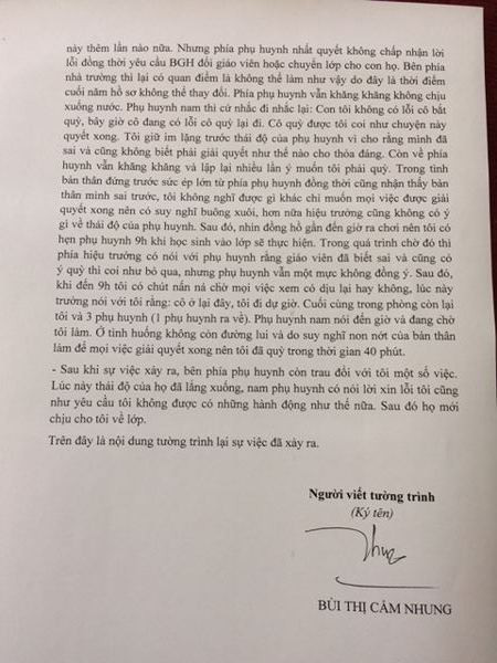 Sau đó khi đến 9h, tôi có chút nấn ná chờ mọi việc xem có dịu lại hay không, lúc này hiệu trưởng nói với tôi rằng: Cô ở lại đây, tôi đi dự giờ. Cuối cùng trong phòng còn lại tôi và 3 phụ huynh (1 phụ huynh đã ra về), phụ huynh nam nói đến giờ và đang chờ tôi làm. Ở tình huống không còn đường lui và do suy nghĩ non nớt của bản thân muốn làm để mọi việc giải quyết xong nên tôi đã quỳ trong thời gian 40 phút”.