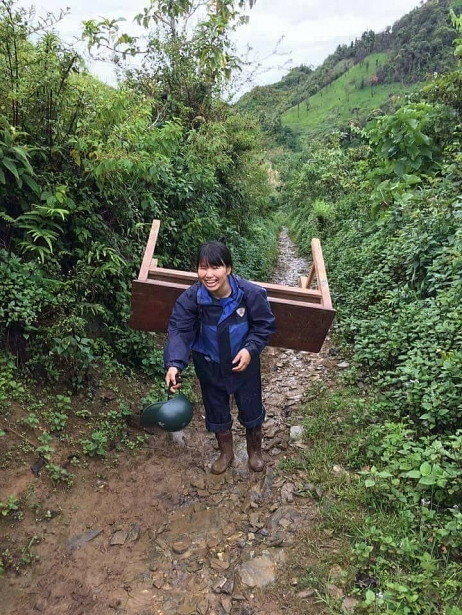"Sáng hôm qua lúc vận chuyển ghế cho các em học sinh trời đổ mưa rất to. Chúng tôi chân đi ủng, mang theo cả áo mưa, quần áo khô rồi người thì cõng, gánh hay vác cả bàn ghế lên vai và băng rừng. Đoạn đường từ bản Pa Cha Ô ra được đường lớn (mà ô tô có thể đi) mất khoảng 2 tiếng đồng hồ đi bộ. Khi cõng đồ, mệt ở đâu thì ngồi nghỉ ở đó", cô Giao chia sẻ.