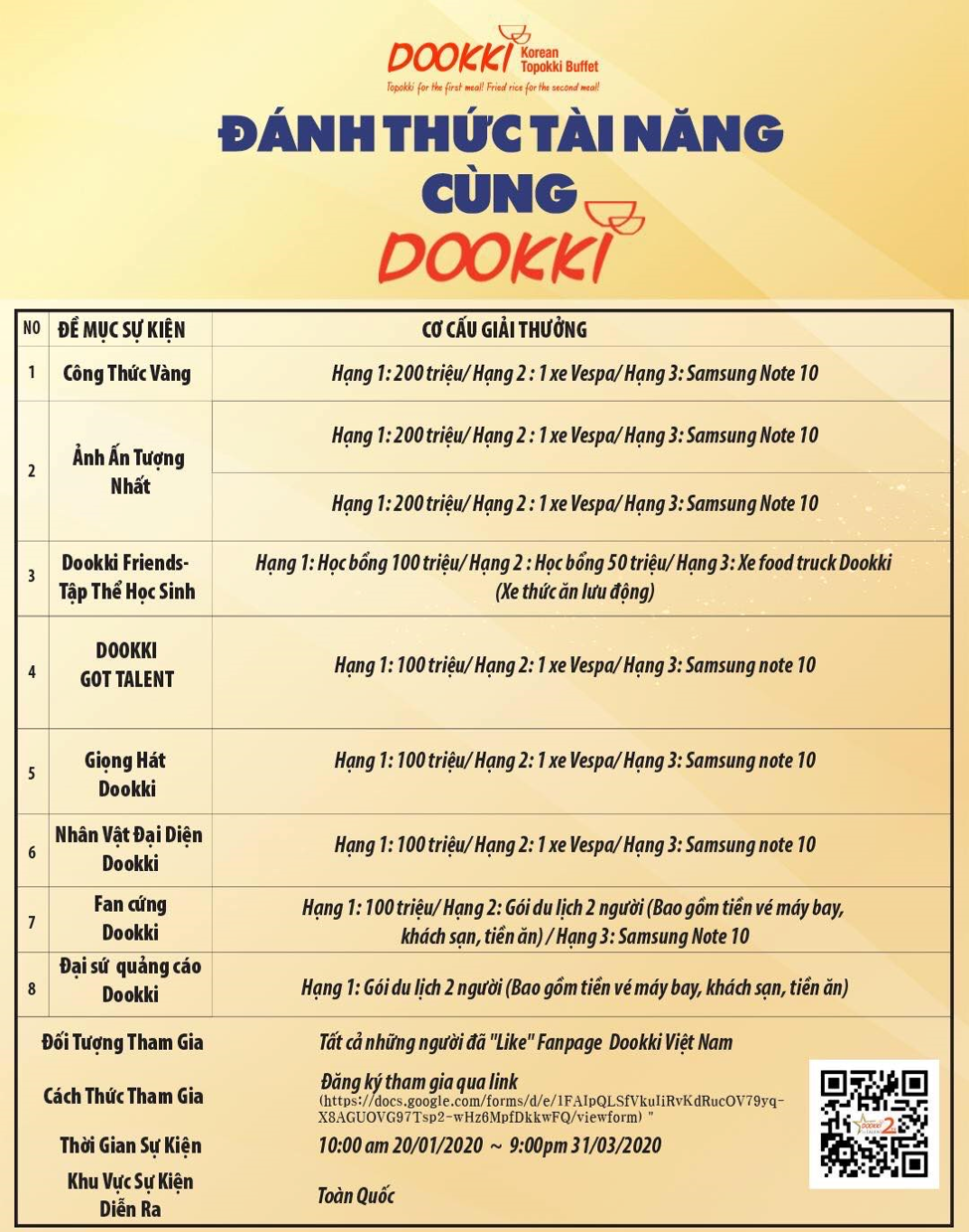 Vậy nên ước mơ đến với Hàn Quốc, thưởng thức ẩm thức xứ sở Kim Chi đã ở gần ngay trước mắt các bạn rồi đấy. Bạn chỉ cần “Like” Fanpage Dookki Việt Nam và điền vào link đăng kí bên dưới là đã có cơ hội tham gia nhận quà ngay và luôn trong hôm nay. Các đề mục sự kiện tranh giải thưởng bao gồm: công thức vàng, ảnh ấn tượng nhất, giọng hát Dookki hay Fan cứng Dookki,..sẽ giúp bạn “Rinh” về phần thưởng lớn như đang nằm trong mơ vậy.