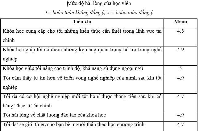 Nhà trường đã làm khảo sát để điều tra mức độ hài lòng của học viên về chương trình đào tạo, cụ thể về Kiến thức chuyên ngành, kỹ năng hỗ trợ nghề nghiệp, khả năng sử dụng ngoại ngữ đã đạt được trong CTĐT; Triển vọng nghề nghiệp, cơ hội thăng tiến sau khi tốt nghiệp và Sự hài lòng về chất lượng đào tạo của chương trình, dự án dựa trên thang đánh giá 5 bậc (trong đó 1 là hoàn toàn không đồng ý, 5 là hoàn toàn đồng ý), và thu về dữ liệu được trình bày trong bảng dưới đây.