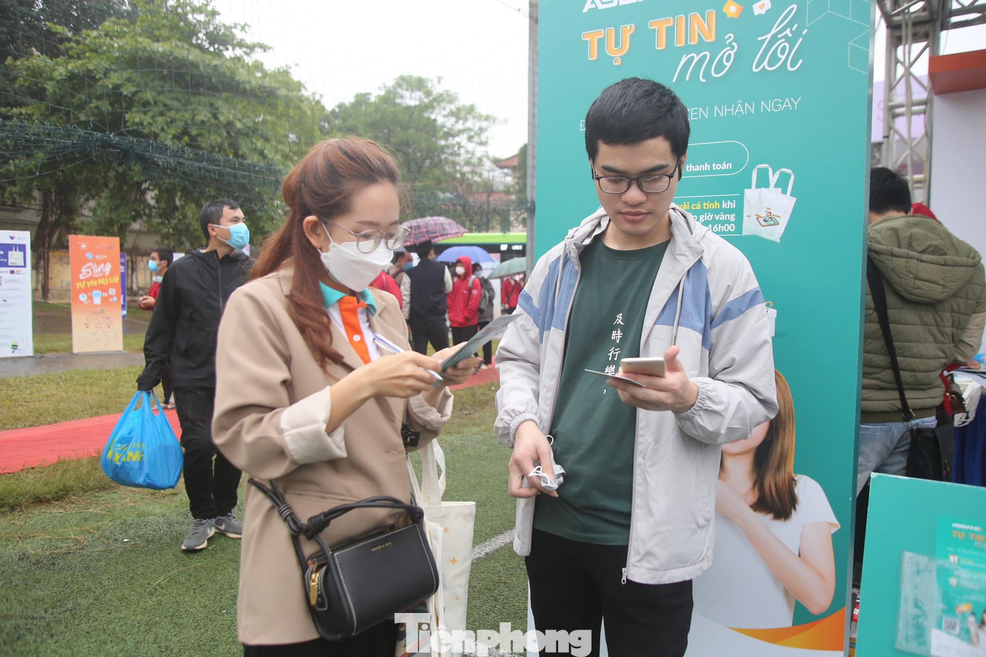 | Các bạn trẻ tập trung trong gian hàng để đăng ký sử dụng app AB Ditizen trên điện thoại cá nhân. |