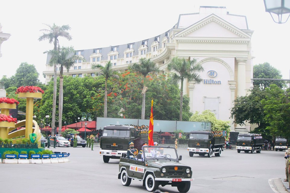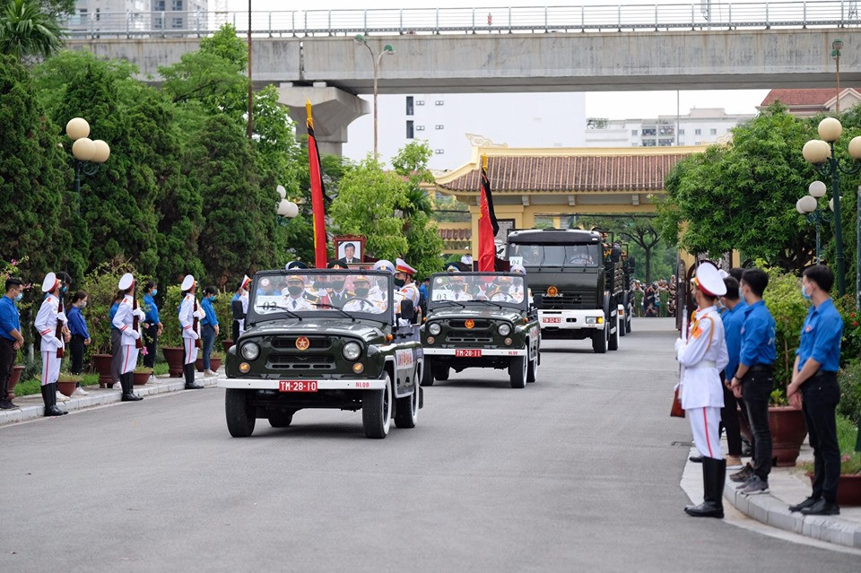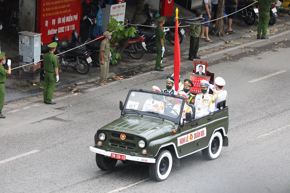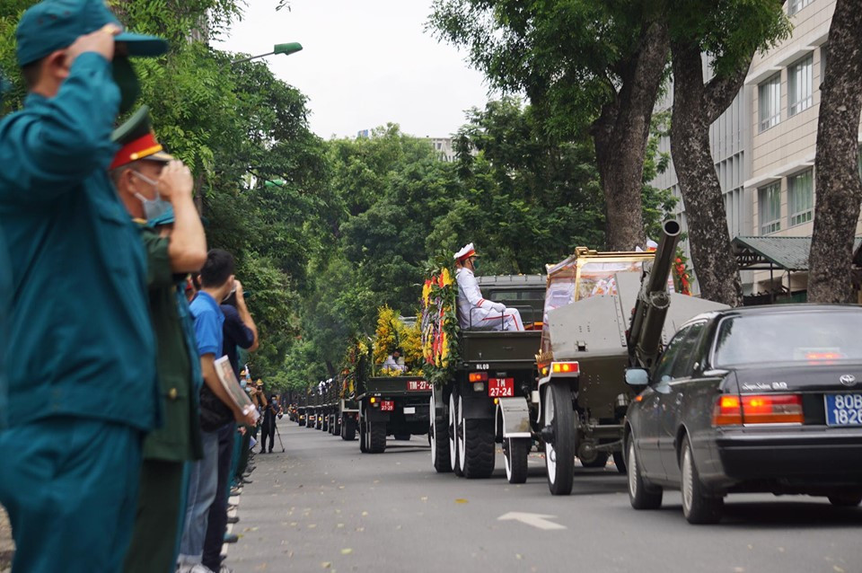 Theo quy định, phương tiện phục vụ lễ tang do Bộ Quốc phòng chuẩn bị, gồm: 1 xe chỉ huy; 1 xe chở quốc kỳ, ảnh, gối Huân chương; 1 xe chở quân kỳ; 6 xe chở đội hình danh dự; 1 xe hoa; 1 xe kéo xe tang (phía cuối xe tang là khẩu lựu pháo 122 mm); 1 xe dự phòng; 2 xe thông tin, 1 xe cứu thương. Ảnh: Như Ý.