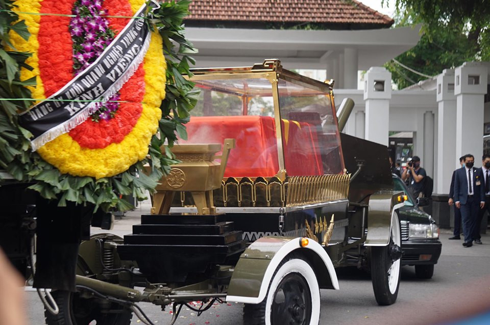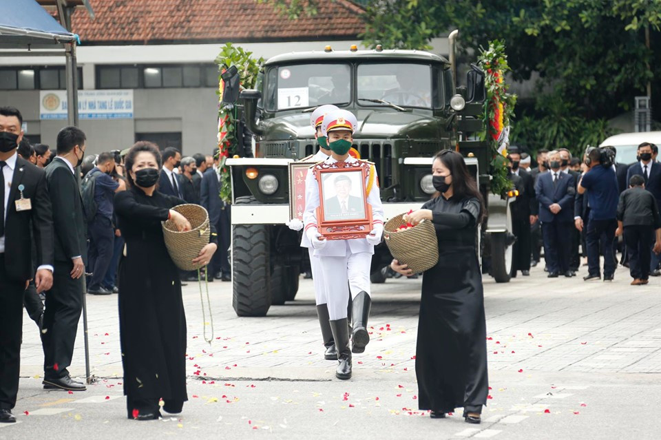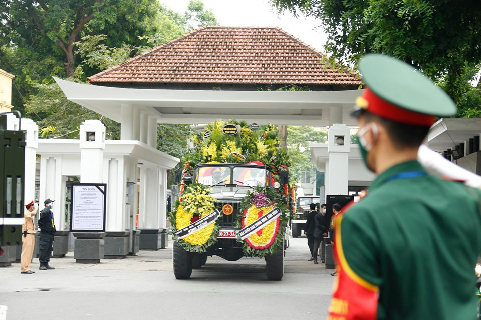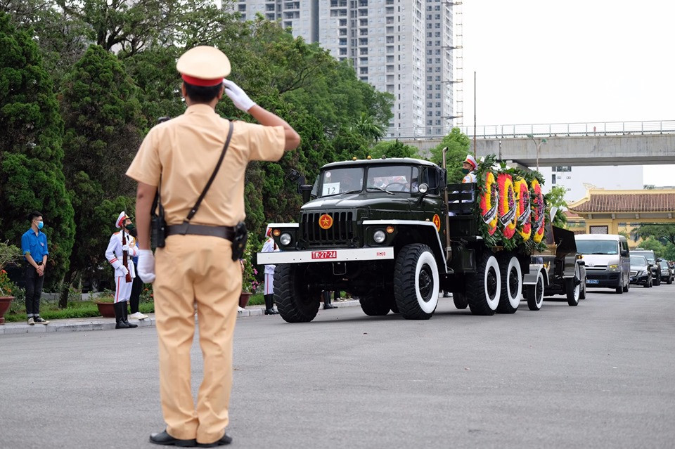 13h25, cỗ linh xa đưa linh cữu nguyên Tổng Bí thư Lê Khả Phiêu rời Nhà tang lễ Quốc gia, hướng về Nghĩa trang Mai Dịch, Thủ đô Hà Nội. Ảnh: Như Ý.
