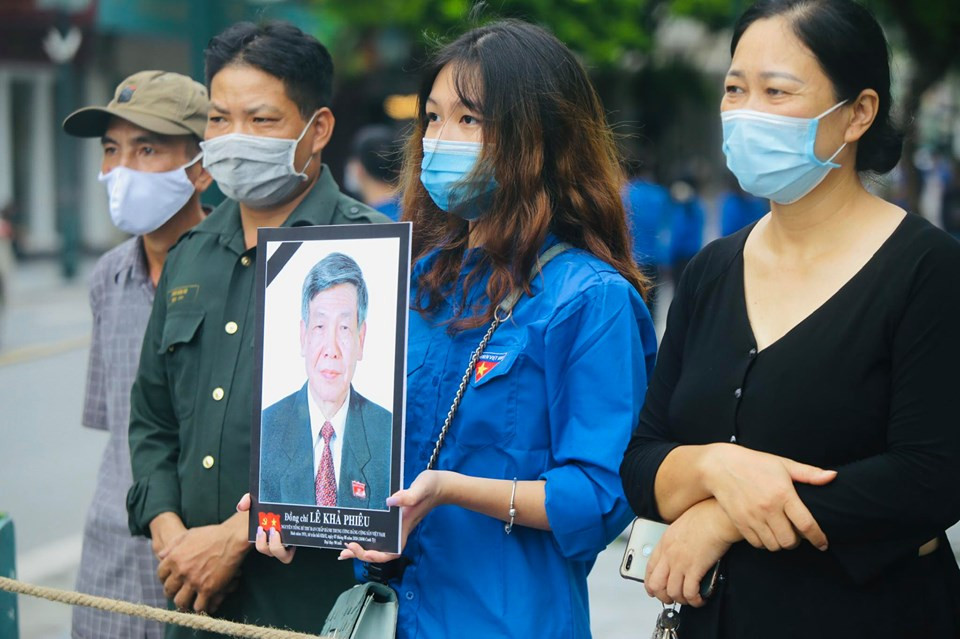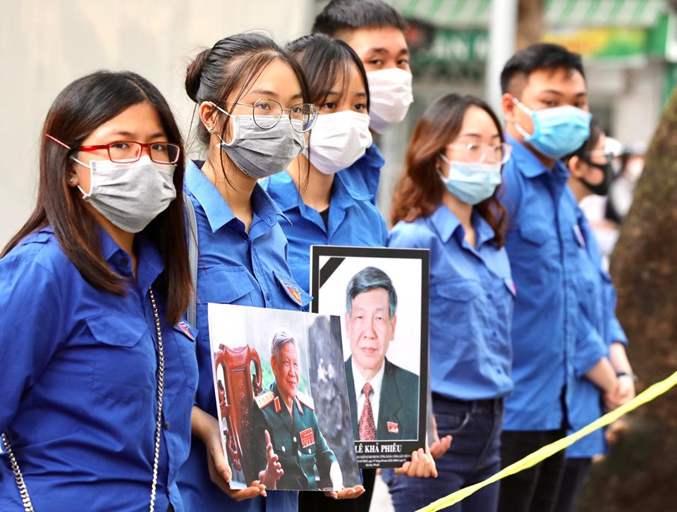 Đoàn viên, thanh niên Thủ đô cầm ảnh nguyên Tổng Bí thư Lê Khả Phiêu đón đoàn linh xa đi qua. Ảnh: Hồng Vĩnh.