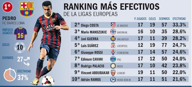 Rõ ràng, xét về danh tiếng và cả số bàn thắng từ đầu mùa, Pedro Rodriguez không thể sánh với Ronaldo, Messi, Suarez, Diego Costa, Cavani hay Neymar... nhưng nếu tính về hiệu suất dứt điểm thành bàn, chẳng ai có thể bì nổi với anh. Thế nên chẳng sai khi Barcelona đã trói tiền đạo người Tây Ban Nha này bằng bản hợp đồng có điều khoản phá vỡ lên tới 150 triệu euro. Rõ ràng họ hiểu giá trị của Pedro Rodriguez!