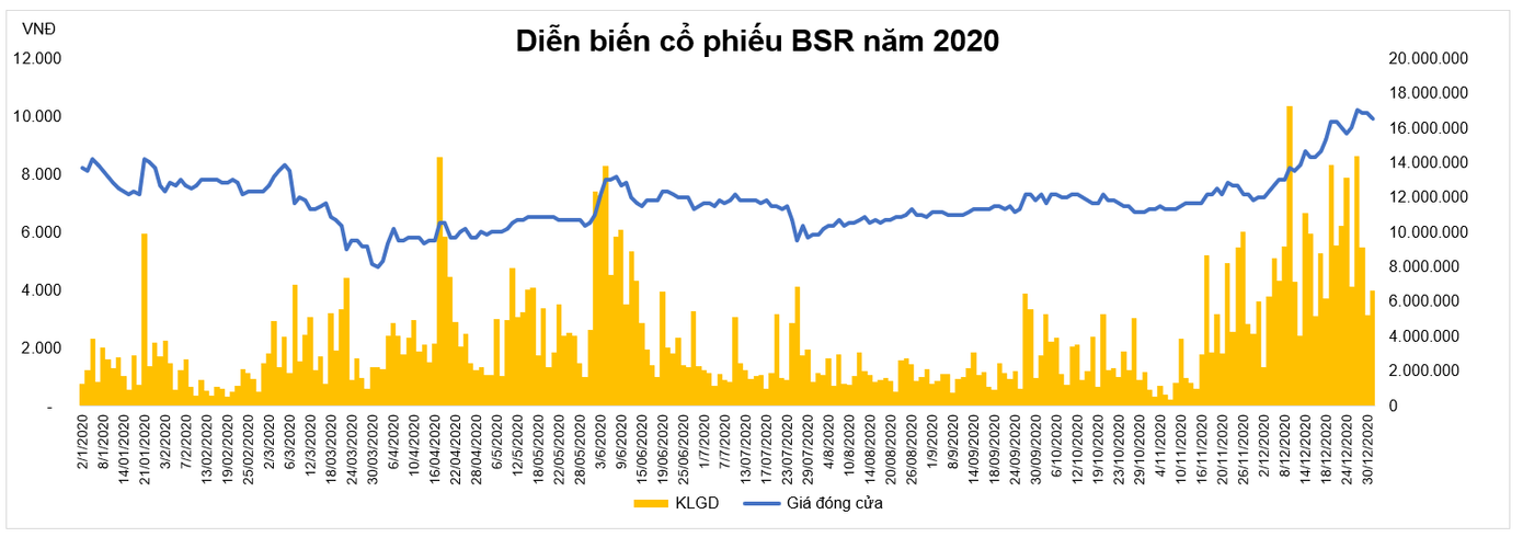 Giá cổ phiếu BSR có thời điểm lao dốc mạnh xuống mức đáy của năm 2020 là 4.800 VNĐ/cổ phiếu vào phiên 31/03/2020. Tuy nhiên, giá sau đó đảo chiều tăng trở lại, có những thời điểm vượt lên trên mệnh giá và đạt đỉnh của năm ở mốc 10.500 VNĐ/cổ phiếu tại phiên 30/12/2020. Chốt năm 2020 giá cổ phiếu đạt mức tăng trưởng 20,7% so với đầu năm và tăng hơn 106% so với mức đáy của năm. Đây được xem là mức tăng khá tốt so với các doanh nghiệp cùng ngành. Thanh khoản bình quân cũng tăng trưởng vượt bậc từ mức 1,73 triệu cổ phiếu/phiên trong năm 2019 lên 3,64 triệu cổ phiếu/phiên trong năm 2020 và đứng Top 3 của ngành. Cổ phiếu nhận được nhiều sự quan tâm của nhà đầu tư, được giao dịch sôi động hơn, đặc biệt lượng giao dịch trong hai tháng cuối năm có những phiên đạt hơn 10 triệu cổ phiếu.