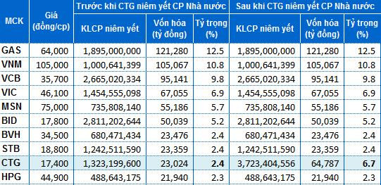 Với tính thanh khoản cao sẵn có, thông qua việc niêm yết thêm 2,4 tỷ cổ phần CTG do của Nhà nước nắm giữ, CP CTG sẽ tăng sức ảnh hưởng lên toàn bộ rổ chỉ số VN-Index. Đồng thời, nhiều nhà đầu tư cũng kỳ vọng chỉ số thị trường sẽ bớt méo mó hơn khi phụ thuộc quá lớn vào một vài CP như thời gian vừa qua.
