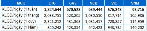 Xét về thanh khoản trong vòng 1 năm trở lại đây của top 5 CP ảnh hưởng mạnh lên chỉ số thị trường, khối lượng giao dịch bình quân của CTG cũng đang dẫn đầu với hơn 2 triệu CP/tháng và 2,3 triệu CP/quý.