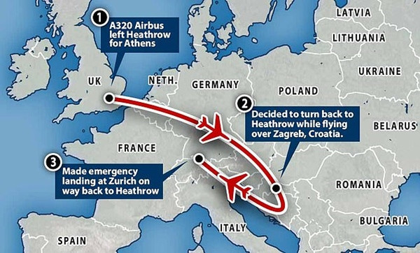 Đây là chuyến bay kéo dài 3 tiếng rưỡi, và đi được nửa đường thì cơ phó đã nói là thấy mệt. Lúc đó, cơ trưởng quyết định quay đầu máy bay, bay ngược về sân bay Heathrow (Anh).
