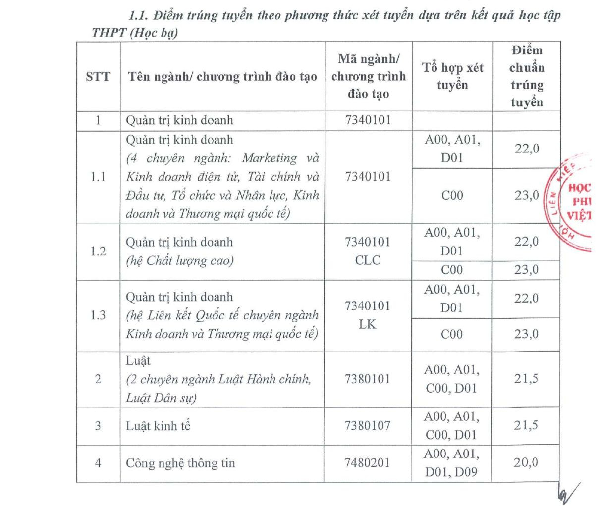 Đối với phương thức xét tuyển kết hợp chứng chỉ tiếng Anh quốc tế và học bạ, thí sinh đạt từ 22 điểm trở lên đều trúng tuyển vào các ngành học đã đăng ký.