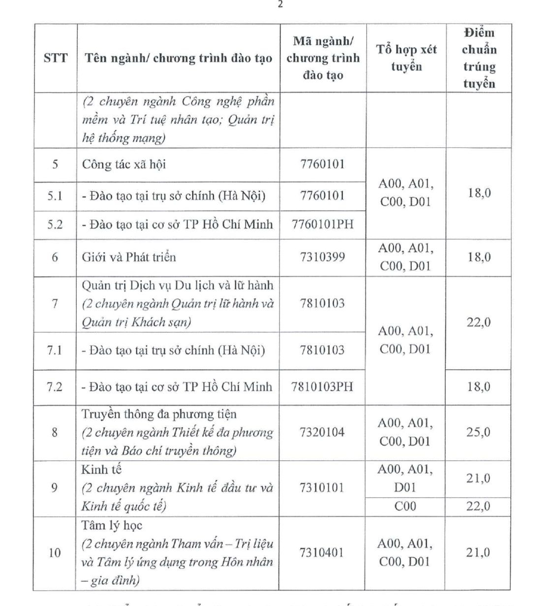 Theo đó, ngành có điểm trúng tuyển theo phương thức xét tuyển dựa trên kết quả học tập THPT (trừ điều kiện tốt nghiệp THPT) là ngành Truyền thông đa phương tiện với mức 25 điểm cho tất cả các tổ hợp xét tuyển A00, A01, C00, D01.