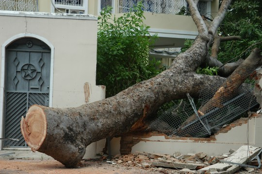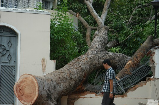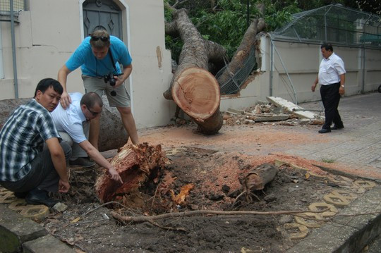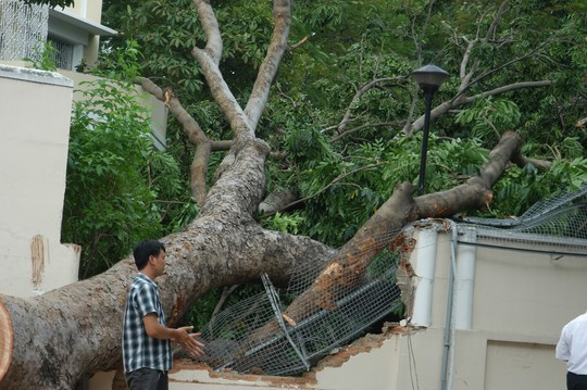 Rất may, khi bật gốc cây đổ về phía hàng rào không người, không đổ ra đường nên không gây thiệt hại về người.