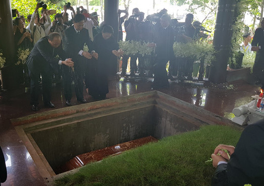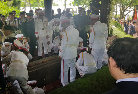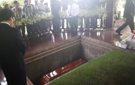 Lãnh đạo, nguyên lãnh đạo Đảng, Nhà nước và gia đình thả nắm đất đầu tiên lên mộ nguyên Thủ tướng Phan Văn Khải. Sau khi lấp mộ và phủ vòng hoa, mọi người đi vòng quanh mộ và dành một phút mặc niệm tưởng nhớ người con ưu tú của đất thép thành đồng. Nguyên Thủ tướng Phan Văn Khải đã đi vào giấc ngủ vĩnh hằng trong lòng đất mẹ. Ảnh: Zing