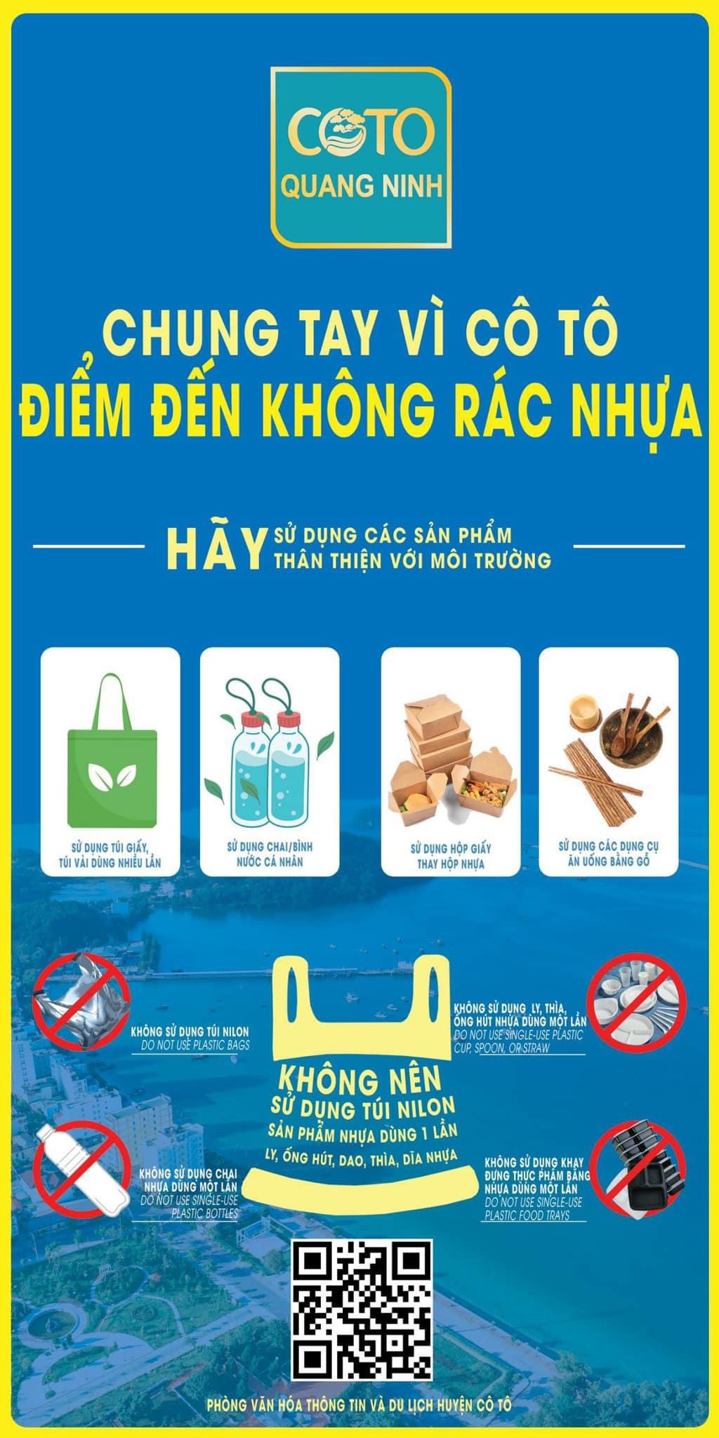 Để tiếp tục thực hiện hiệu quả Đề án 175 huyện Cô Tô không rác thải nhựa trong hoạt động du lịch, Phòng Văn hóa-Thông tin và Du lịch huyện yêu cầu các cơ sở lưu trú, công ty du lịch trên địa bàn triển khai biện pháp bảo vệ môi trường trong hoạt động kinh doanh dịch vụ du lịch, không sử dụng túi nylon và đồ nhựa dùng một lần, thay thế chai nước dùng nhiều lần tại cơ sở. Đồng thời tăng cường sử dụng sản phẩm thân thiện môi trường như túi giấy, túi vải sử dụng nhiều lần, sản phẩm tái chế.