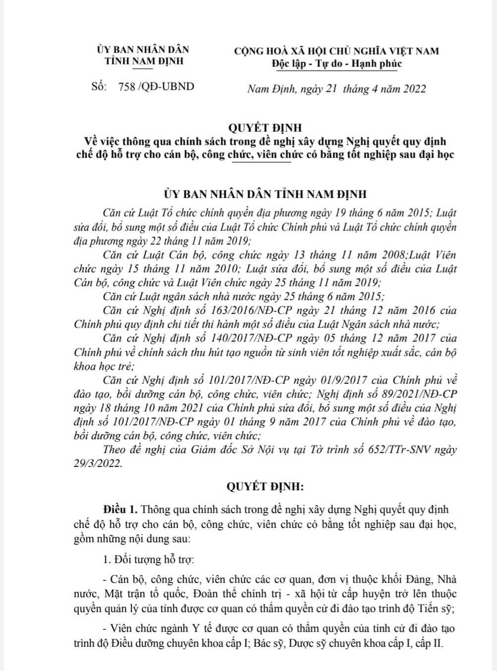 Ngày 22/4, thông tin với Tiền Phong, Phó Chủ tịch Thường trực UBND tỉnh Nam Định, ông Trần Anh Dũng cho biết vừa ký ban hành Quyết định số 758/QĐ-UBND của UBND tỉnh Nam Định về việc thông qua chính sách trong đề nghị xây dựng Nghị quyết quy định chế độ hỗ trợ cho cán bộ, công chức, viên chức có bằng tốt nghiệp sau đại học (TNSĐH).
