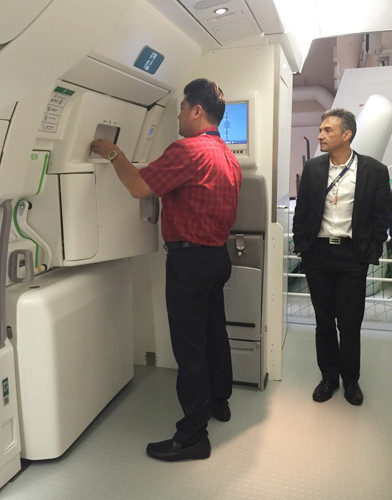 Chuyến bay đầu tiên của tôi trên cương vị cơ trưởng A350 là vào ngày 16/6, cùng với chuyên gia của Airbus tại xưởng lắp ráp ở Toulouse (Pháp). Song đây là chuyến bay không hề dễ chịu như bay thương mại thông thường, bởi phải thực hiện một loạt các hạng mục kiểm tra để đảm bảo toàn bộ hệ thống đều hoạt động tốt, cả những tình huống mà trong thực tế rất hiếm xảy ra. Ví dụ chúng tôi chủ động tắt hệ thống điều áp, làm áp suất trong khoang giảm xuống giới hạn, tất cả mặt nạ dưỡng khí trên trần bung ra và hệ thống báo động được kích hoạt…
