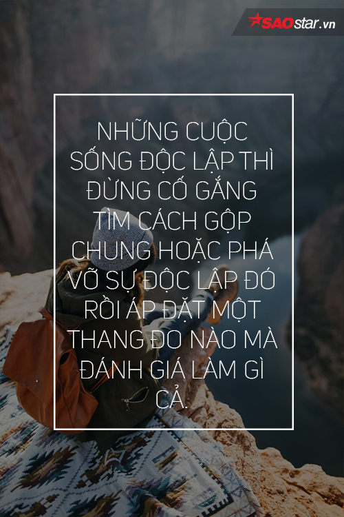 Những cuộc sống độc lập thì đừng cố gắng tìm cách gộp chung hoặc phá vỡ sự độc lập đó rồi áp đặt một thang đo nào mà đánh giá làm gì cả. Chúng ta đi du lịch chung quy là để bản thân vui vẻ và hạnh phúc, mà hạnh phúc thì ở trong trái tim mình, bạn chả cần phải đi du lịch nơi nào quá xa mới có thể cảm nhận được điều đó, đúng không?