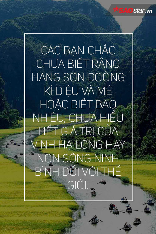 Chắc bạn không biết được đỉnh Fansipan cao và choáng ngợp đến thế nào, chắc chưa biết rằng hang Sơn Đoòng kì diệu và mê hoặc biết bao nhiêu, chưa hiểu hết giá trị của vịnh Hạ Long hay non sông Ninh Bình đối với thế giới.