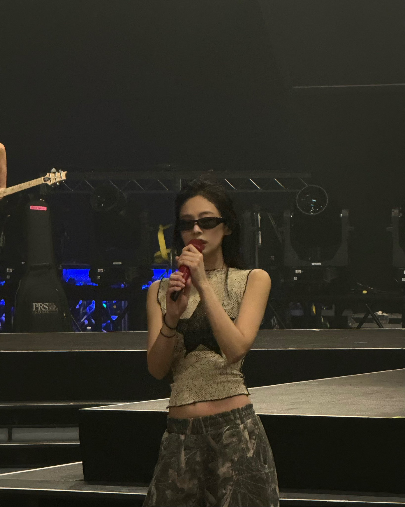 Jennie trực tiếp tới đại nhạc hội cùng Rosé ủng hộ cho màn trình diễn của "em út" Lisa và đồng nghiệp. Diện mạo "chất chơi" của nữ idol trong thiết kế áo liền mũ, hở lưng phối cùng quần thụng, kính râm gây sốt.