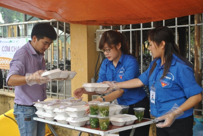 Gần hai tháng nay, cứ vào trưa thứ Sáu hàng tuần, tại cổng trường đại học Khoa học tự nhiên, thuộc đại học quốc gia Hà Nội, một nhóm các bạn tình nguyện viên trong CLB tình nguyện Hope tổ chức bán “cơm chay yêu thương” giá chỉ 5000 đồng cho các bạn sinh viên và người lao động nghèo ở quanh đó.