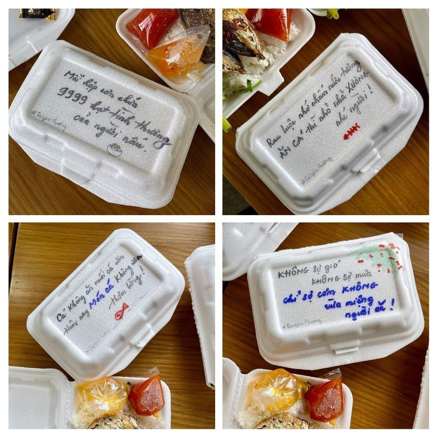 Trên nắp hộp xốp trắng, những dòng chữ xanh, đỏ kèm hình vẽ minh họa dễ thương đã mang đến niềm vui cho bất cứ ai trông thấy. “Cơm này từ tấm lòng thành, ăn mà ngon quá đừng giành kế bên”, “Cơm này không tính bằng tiền, quy ra tình cảm cả miền yêu thương”… là những câu được Phúc Lợi ngẫu hứng sáng tác vì muốn lan tỏa năng lượng tích cực đến mọi người. Với anh, tinh thần lạc quan là “chìa khóa” để vượt qua giai đoạn khó khăn này.