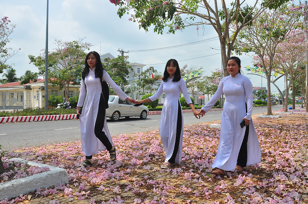 Nữ sinh check-in trên con đường hoa kèn hồng
