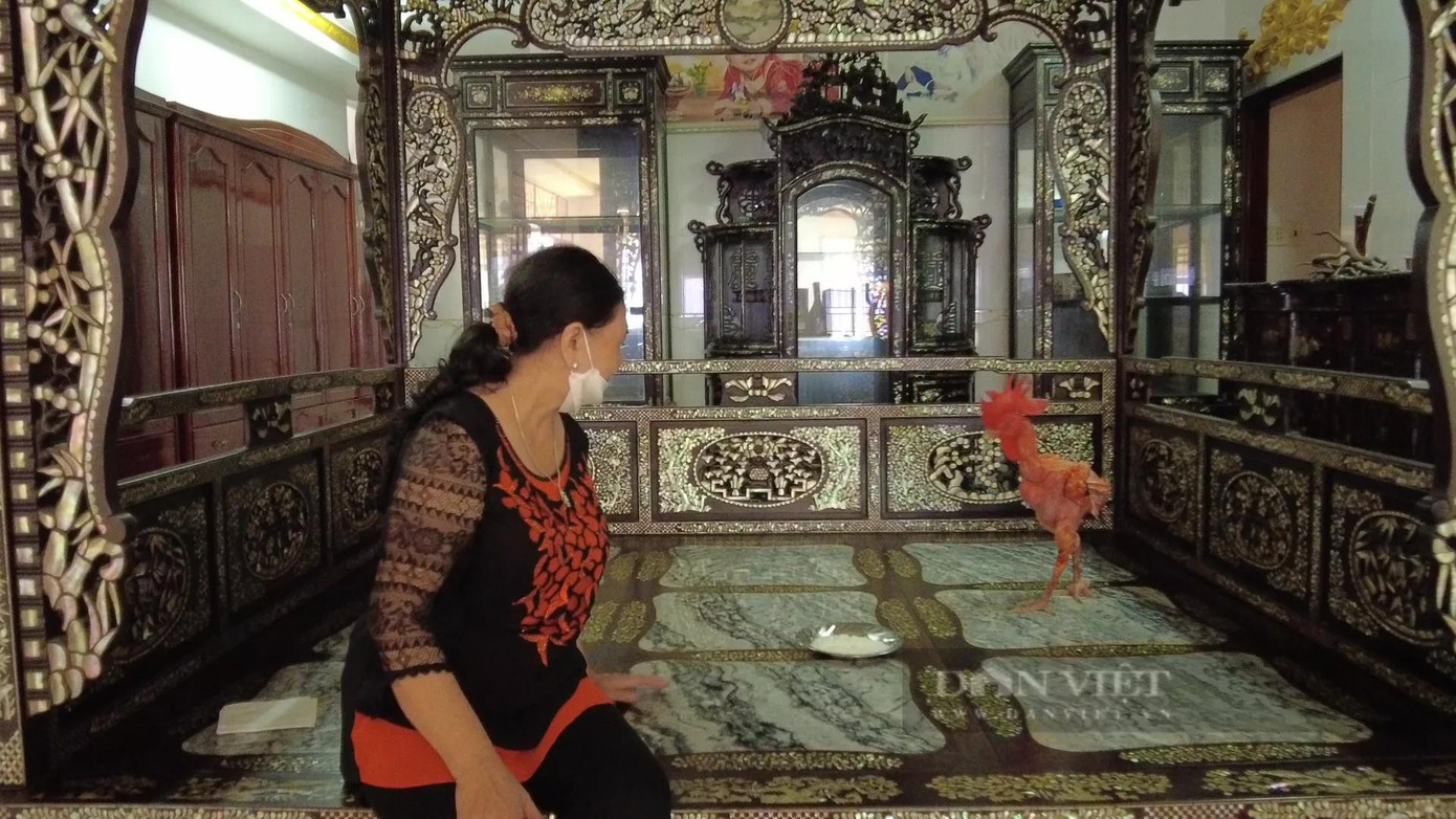 Được ví như thành viên gia đình nên ngoài khẩu phần ăn hàng ngày, con gà còn ghiền ăn trái cây, nhất là ăn sầu riêng. Bởi, thương chú gà đặc biệt nên mấy năm qua gia đình cưng chiều vuốt ve, tối cho ngủ mùng và ngày ngày dạo sân tắm nắng, chơi trên long sàng đồ cổ.
