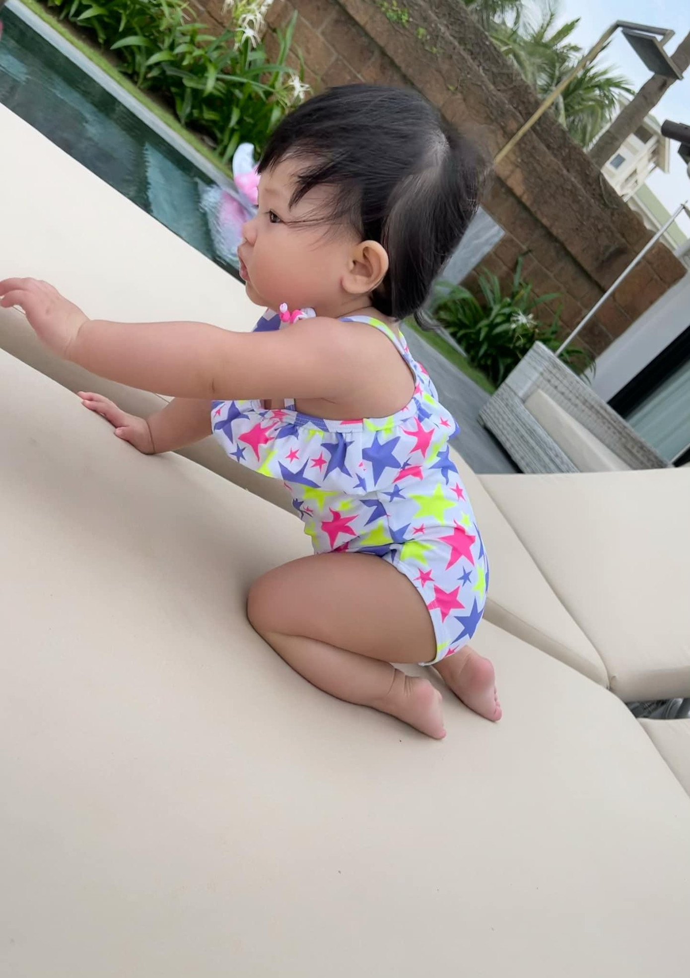 Trong chuyến du lịch gần đây, Suchin thậm chí còn diện hàng loạt bộ đồ bơi khác nhau. Những thiết kế có màu sắc tươi sáng, nữ tính nhưng được sử dụng chất liệu cao cấp không kém trang phục của người lớn. Bên cạnh đó các outfit đơn giản, có độ thấm hút tốt cũng được Đàm Thu Trang mua cho con gái.