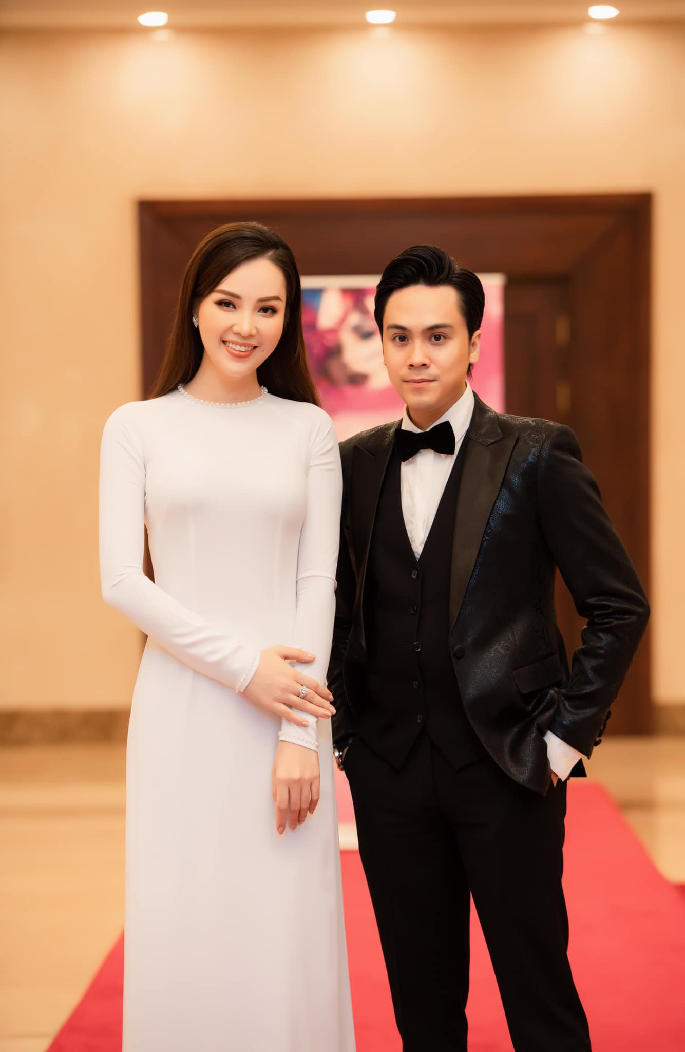 Á hậu Thuỵ Vân diện áo dài trắng nền nã, đảm nhận vai trò MC trong một chương trình bên MC Thái Dũng.