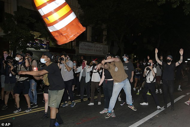 Nhóm người biểu tình nhất quyết không rời khỏi lòng đường, và liên tục ném đồ vật về phía cảnh sát.