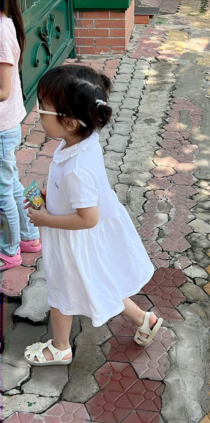 Destiny diện chiếc đầm trắng, buộc tóc hai bên, đi dép quai hậu cùng cặp mắt kính dễ thương. Dù diện bộ cánh đơn giản song cô bé vẫn toát lên được vẻ xinh xắn, điệu đà và không kém phần hài hước khi tạo dáng cùng bố Trường Giang.