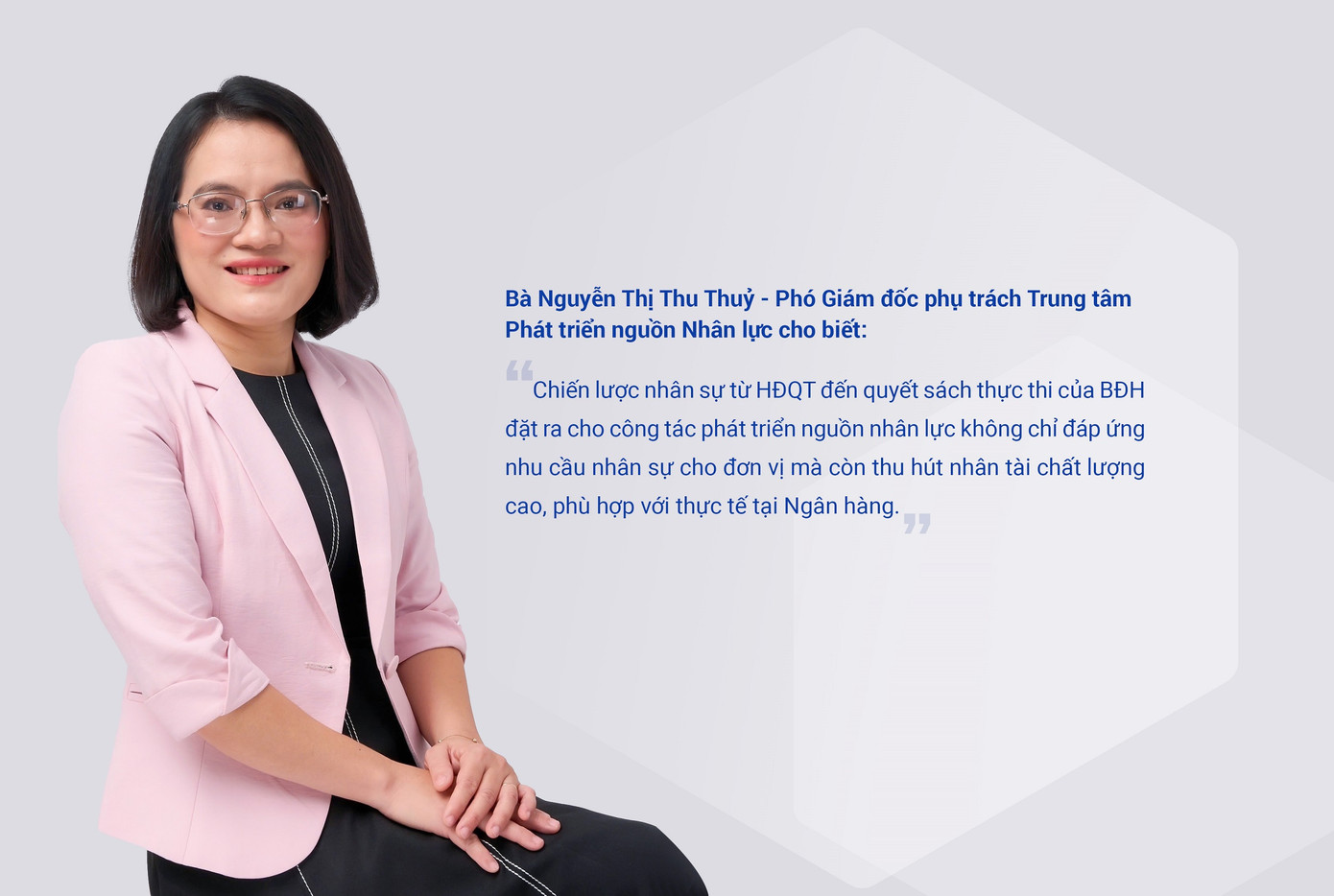 Bà Nguyễn Thị Thu Thuỷ - Phó Giám đốc phụ trách Trung tâm Phát triển nguồn Nhân lực cho biết: “Chiến lược nhân sự từ HĐQT đến quyết sách thực thi của BĐH đặt ra cho công tác phát triển nguồn nhân lực không chỉ đáp ứng nhu cầu nhân sự cho đơn vị mà còn thu hút nhân tài chất lượng cao, phù hợp với thực tế tại Ngân hàng. Chúng tôi còn bài toán nâng cao phải giải định kỳ – làm sao để tăng thu nhập, phúc lợi và hoạt động gắn kết của CBNV một cách kịp thời, thường xuyên, nhất quán”.