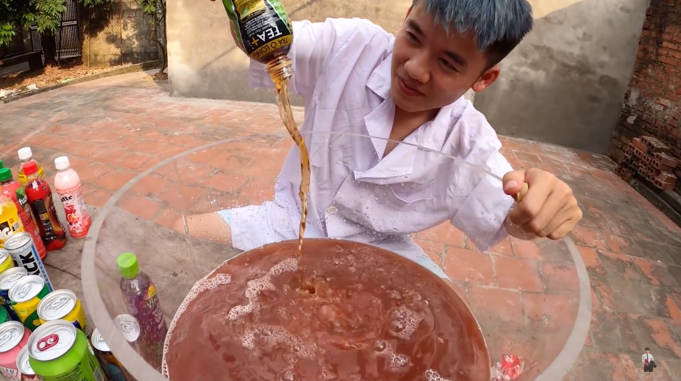 Trong clip, Hưng Vlog chuẩn bị một cái thau to, sau đó anh chàng đổ 50 loại nước ngọt vào từ đồ uống có gas cho đến nước bí đao, lựu, cam, chanh… với các kích cỡ khác nhau. Sau khi trộn các loại nước trên với nhau, thành phẩm là một thứ nước màu đỏ nâu, đục ngầu và nổi bọt khiến nhiều người cảm thấy "sợ hãi".