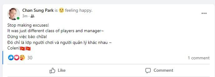 "Hãy ngừng đổ lỗi. Kết quả này chỉ cho thấy sự khác biệt về đẳng cấp giữa cầu thủ và huấn luyện viên của hai đội. Việt Nam cố lên!", Park Chan-sung viết trên Facebook.