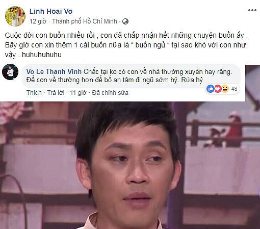 Đáng chú ý lại là bình luận của Võ Lê Thành Vinh- con trai ruột của danh hài Hoài Linh. Những lời động viên cha của Thành Vinh khiến nhiều người xúc động: “Chắc tại không có con về nhà thường xuyên hay răng? Để con về thường xuyên hơn, để bố an tâm đi ngủ sớm".