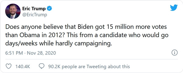 Lần này, Eric - con trai thứ của Tổng thống Trump - lại cố bênh bố bằng cách tỏ ra nghi ngờ kết quả cuộc bầu cử Tổng thống Mỹ: “Có ai tin rằng Biden nhận được nhiều hơn 15 triệu phiếu bầu so với Obama năm 2012? Mà đây (ông Joe Biden) lại là một ứng cử viên có lúc không hề đi vận động suốt nhiều ngày/ nhiều tuần liền”.