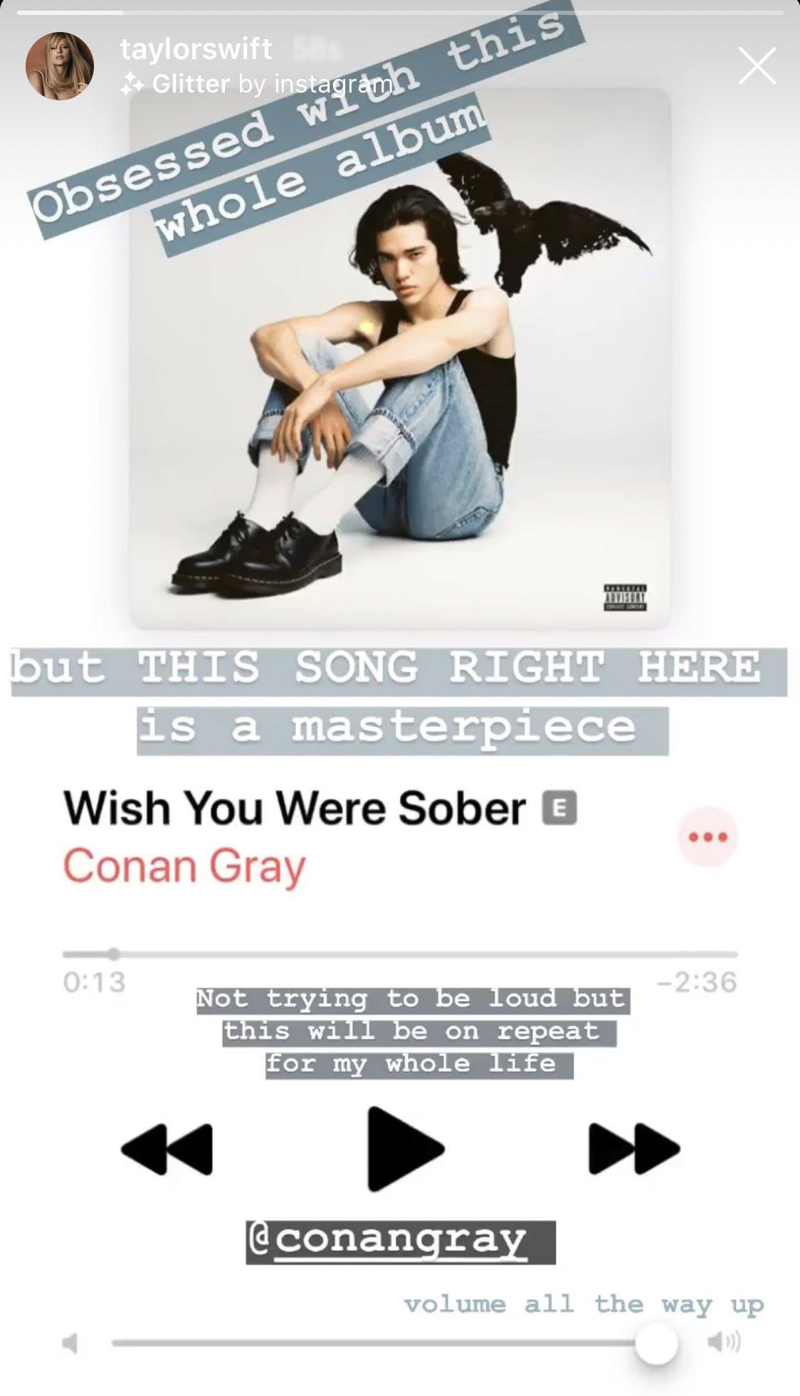 Trong một Story trên trang Instagram của mình, Taylor Swift đã bất ngờ đề xuất bản nhạc của Conan Gray - Wish You Were Sober kèm với lời nhắn: “Bị mê cả album này mất thôi. Nhưng mà ca khúc tôi đặt ở đây mới chính là cực phẩm đó nha!”.