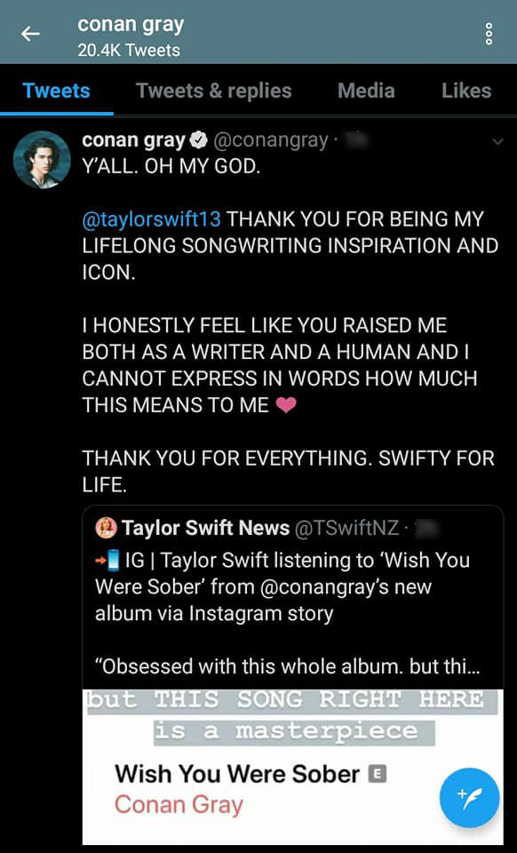 Ngay sau đó, Conan Gray (tất nhiên) đã không thể kiềm chế được sự phấn khích của mình và tweet Taylor Swift trên Twitter của mình với nội dung: “Trời đất ơi! @Taylor ơi, cảm ơn chị đã trở thành nguồn cảm hứng bất tận trong việc trở thành một người sáng tác và trở thành biểu tượng âm nhạc. Em thật lòng cảm thấy như chị đang giúp em trưởng thành trong việc sáng tác và trở thành một con người tốt. Em không thể diễn tả bằng lời những điều chị làm có ý nghĩa với em như thế nào đâu. Cảm ơn chị về tất cả. Em sẽ là một Swifty trọn đời”.